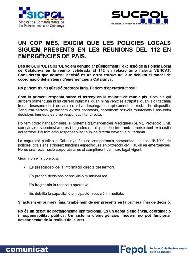 Des de SUCPOL i SICPOL volem denunciar públicament l’ exclusió de la Policia Local de Catalunya en la reunió celebrada al 112 en relació amb l’alerta VENCAT. Considerem que aquesta decisió és un error estructural que debilita el model de coordinació del sistema d’emergències a Catalunya. No parlem d’una qüestió protocol·lària. Parlem d’operativitat real: Som […]