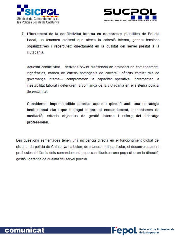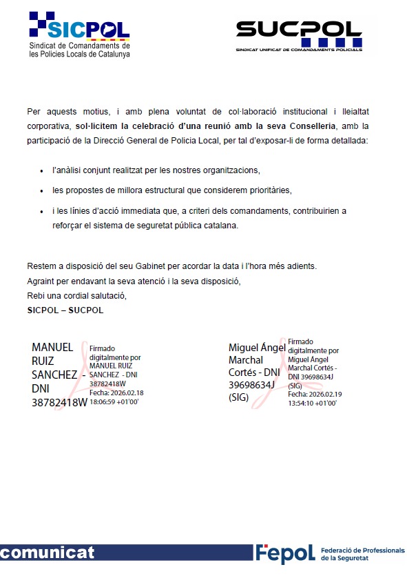Demanem aquesta reunió urgent per abordar la situació estructural de les Policies Locals i dels Vigilants Municipals, i per traslladar al departament que l’increment retributiu dels Mossos d’Esquadra té un impacte directe en l’equilibri del sistema policial català. Sense mesures correctores, es pot accentuar la desigualtat entre cossos, generar desmotivació, afavorir la fuga de talent i agreujar les dificultats estructurals que ja pateixen moltes plantilles municipals.